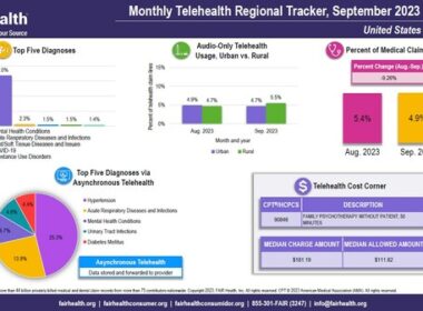 Top Five Telehealth DiagnosesIn September 2023, COVID-19 entered the rankings of the top five telehealth diagnoses in the Midwest (at number four) and fell out of the rankings in the South and West. COVID-19 remained in second place in the Northeast, the same rank as in August. Nationally, COVID-19 fell from third to fourth place.In September, the percentage of telehealth claim lines for mental health conditions continued to decrease nationally and in every region, as it had in August. However, mental health conditions remained the number one telehealth diagnosis nationally and in every region, as it had since March 2020.Audio-Only Telehealth UsageIn September 2023, as in previous months, rural areas showed higher utilization of audio-only telehealth than urban areas in every region except the South, where the pattern was reversed. Audio-only telehealth utilization increased in both rural and urban areas in every region and nationally, except for urban areas of the South, which had a decrease of 14.4 percent, and urban areas nationally, which had a decrease of 4.1 percent.Telehealth Cost CornerFor September 2023, the Telehealth Cost Corner spotlighted the cost of CPT®3 90846, 50-minute family psychotherapy without patient. Nationally, the median charge amount for this service when rendered via telehealth was $181.19, and the median allowed amount was $111.82.4About the Monthly Telehealth Regional TrackerLaunched in May 2020 as a free service, the Monthly Telehealth Regional Tracker uses FAIR Health data to track how telehealth is evolving from month to month. An interactive map of the four US census regions allows the user to view an infographic on telehealth in a specific month in the nation as a whole or in individual regions. Each infographic shows month-to-month changes in volume of telehealth claim lines and audio-only telehealth usage (urban versus rural); the Telehealth Cost Corner, which presents a specific telehealth procedure code with its median charge amount and median allowed amount; and that month’s top five telehealth diagnoses and top five diagnoses via asynchronous telehealth.FAIR Health President Robin Gelburd stated: “We welcome sharing these varying windows into telehealth utilization as it continues to evolve. This is one of the many ways we pursue our healthcare transparency mission.”For the Monthly Telehealth Regional Tracker, click here.Follow us on Twitter @FAIRHealthAbout FAIR HealthFAIR Health is a national, independent nonprofit organization that qualifies as a public charity under section 501(c)(3) of the federal tax code. It is dedicated to bringing transparency to healthcare costs and health insurance information through data products, consumer resources and health systems research support. FAIR Health possesses the nation’s largest collection of private healthcare claims data, which includes over 44 billion claim records and is growing at a rate of over 2 billion claim records a year. FAIR Health licenses its privately billed data and data products—including benchmark modules, data visualizations, custom analytics and market indices—to commercial insurers and self-insurers, employers, providers, hospitals and healthcare systems, government agencies, researchers and others. Certified by the Centers for Medicare & Medicaid Services (CMS) as a national Qualified Entity, FAIR Health also receives data representing the experience of all individuals enrolled in traditional Medicare Parts A, B and D; FAIR Health includes among the private claims data in its database, data on Medicare Advantage enrollees. FAIR Health can produce insightful analytic reports and data products based on combined Medicare and commercial claims data for government, providers, payors and other authorized users. FAIR Health’s systems for processing and storing protected health information have earned HITRUST CSF certification and achieved AICPA SOC 2 Type 2 compliance by meeting the rigorous data security requirements of these standards. As a testament to the reliability and objectivity of FAIR Health data, the data have been incorporated in statutes and regulations around the country and designated as the official, neutral data source for a variety of state health programs, including workers’ compensation and personal injury protection (PIP) programs. FAIR Health data serve as an official reference point in support of certain state balance billing laws that protect consumers against bills for surprise out-of-network and emergency services. FAIR Health also uses its database to power a free consumer website available in English and Spanish, which enables consumers to estimate and plan for their healthcare expenditures and offers a rich educational platform on health insurance. An English/Spanish mobile app offers the same educational platform in a concise format and links to the cost estimation tools. The website has been honored by the White House Summit on Smart Disclosure, the Agency for Healthcare Research and Quality (AHRQ), URAC, the eHealthcare Leadership Awards, appPicker, Employee Benefit News and Kiplinger’s Personal Finance. For more information on FAIR Health, visit fairhealth.org.Contact:Rachel KentSenior Director of Communications and MarketingFAIR Health646-396-0795[email protected]1 A claim line is an individual service or procedure listed on an insurance claim.2 Asynchronous telehealth is telehealth in which data are stored and forwarded (e.g., blood pressure or other cardiac-related readings transmitted electronically; A1c levels transmitted electronically).3 CPT © 2023 American Medical Association (AMA). All rights reserved.4 A charge amount is the provider’s undiscounted fee, which a patient may have to pay when the patient is uninsured, or when the patient chooses to go to a provider who does not belong to the patient’s plan’s network. An allowed amount is the total negotiated, in-network fee paid to the provider under an insurance plan. It i